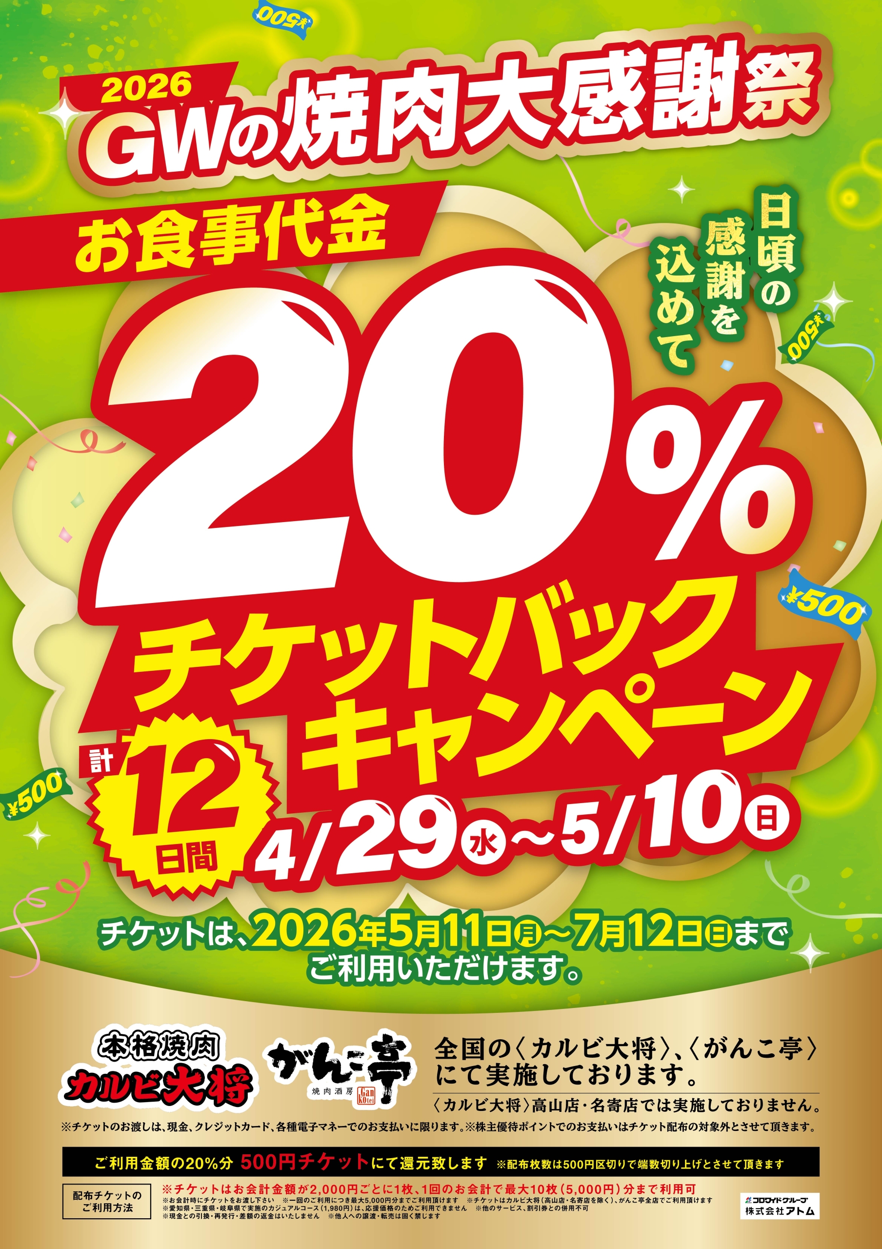 がんこ亭TOPキャンペーン 4/29(水)~GWチケットバックキャン・・・ キャンペーン・お知らせ 2026.04.28 | 4/29(水)~GWチケットバックキャンペーンのお知らせ 開催期間:2026/4/29~5/10 いつもご来店頂きありがとうございます。 4/29(水)~5/10(日)までの12日間! 日頃の感謝を込めてご利用金額の20%チケットバックキャンペーン開催致します! 大変オトクな12日間! 今年のゴールデンウイークはがんこ亭の焼肉食べ放題でおなか一杯お召しあがり下さい! 沢山のご来店、心よりお待ちしております。 店舗一覧 キャンペーン一覧